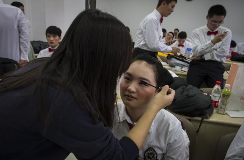 图说:文化部部长刘艺菲同学为参赛同学化妆