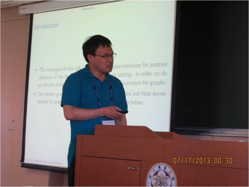 2013年7月14日至2013年7月19日,数学系教师林勇、苏红玲和博士研究生满守东、宋宏业赴台参加了在台湾大学举办的第六届国际华人数学家大会,来自两岸三地和世界各地的1000余数学家参加了会议。林勇老师在会议上应邀做了45分钟的学术报告,报告题目是”Li-Yau inequality on graphs”,学术报告的主要内容是在曲率条件下证明了经典的黎曼流形上的Li-Yau梯度不等式在图上也成立,并由此得到了图上的抛物Harnack不等式和热核估计。苏红玲老师和博士研究生满守东也分别做了20分钟的学术报告。