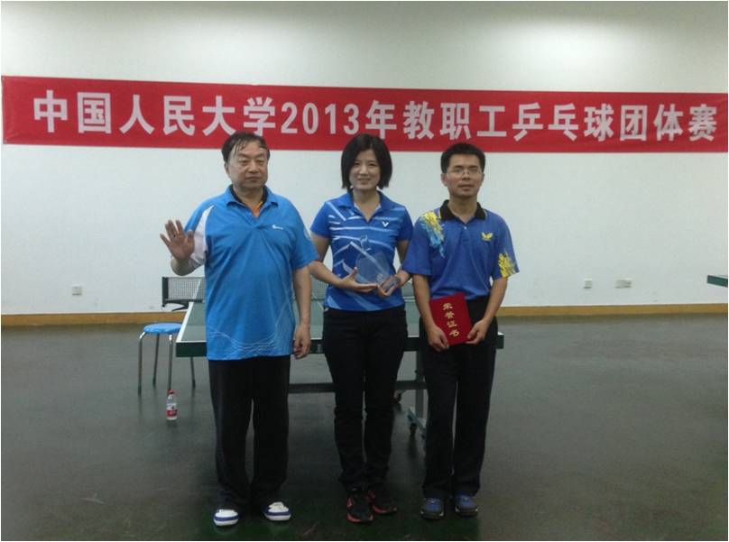 3354cc金沙集团2013年教职工乒乓球团体赛于2013年10月21-29日在世纪馆乒乓球室举行。金沙官网余力副教授、付虹蛟副教授和胡野红老师代表3354cc金沙集团参加比赛。首先,3354cc金沙集团代表队以小组第一强势出线,然后经过八分之一、四分之一、半决赛的拼搏奋战,最终在决赛中战胜对手,赢得团体第一名(冠军)的好成绩。