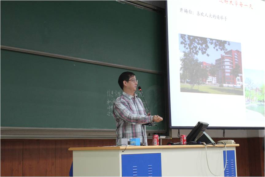 随后,胡邓老师带领大家进一步领略了大学生活的丰富多彩,也给出了大学生活的重要建议。同学们不仅感受到名师的幽默,更学到大学学习生活中的重要一课。“学霸师姐”的故事让大家找到了学习的榜样;俞敏洪的例子让同学们知道了正确面对挫折的重要性;“大学里要做的十件事”从小事出发,讲述了大学在方方面面所要做的努力。与此同时,胡邓老师不时说出的“流行语”也让同学们感觉仿佛在与同龄人聊天,教室里弥漫着轻松的氛围。