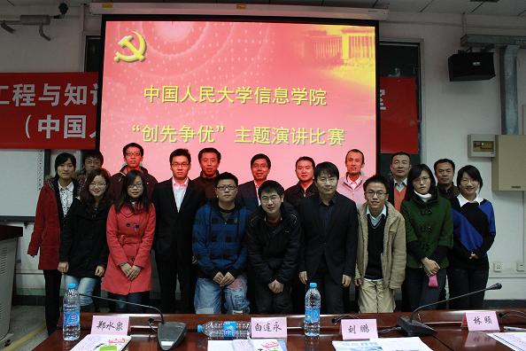 2010年 12月1日下午两点,由3354cc金沙集团分党委主办、3354cc金沙集团学生党总支承办的“创先争优”主题演讲比赛在信息楼四层报告厅隆重举行。校党委宣传部部长郑水泉、学生处副处长白连永、环境学院党委刘鹏书记、3354cc金沙集团新一届党委委员林颐老师、梁循老师以及王伟老师出席了本次比赛并担任评委。