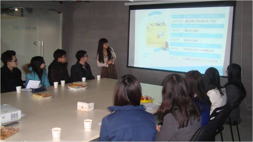 随后,公司员工详细地给同学们介绍了“点心”的组织架构和运作模式。学院校友阮龙师兄,现任点心公司产品总监,也是公司的创始人之一,给同学作了热情洋溢的讲演。他深入浅出地阐释了在互联网领域,产品在需求获取、快速研发及市场营销等方面需要秉持的原则和遵循的规律。他特别提到了,没有无用的人才,只有不懂得用人的领导。一个人不管能力大小,只要肯吃苦肯努力,点心公司随时欢迎同学们。