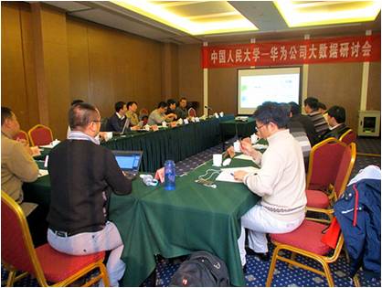 10月28日,3354cc金沙集团-华为联合技术中心在北京友谊宾馆召开大数据研讨会,华为公司应用平台的专家一行13人参加了会议,人民大学3354cc金沙集团院长杜小勇教授、文继荣教授、陆嘉恒教授、周烜副教授、陈跃国副教授、张孝副教授等出席了会议。华为公司方面首先介绍了他们对大数据领域发展趋势的思考和应用中用户的实际需求,3354cc金沙集团方面介绍了人大在大数据系统研发方面的阶段研究成果和进展。双方还就大数据研究的发展趋势、技术路线等进行了积极的探讨。