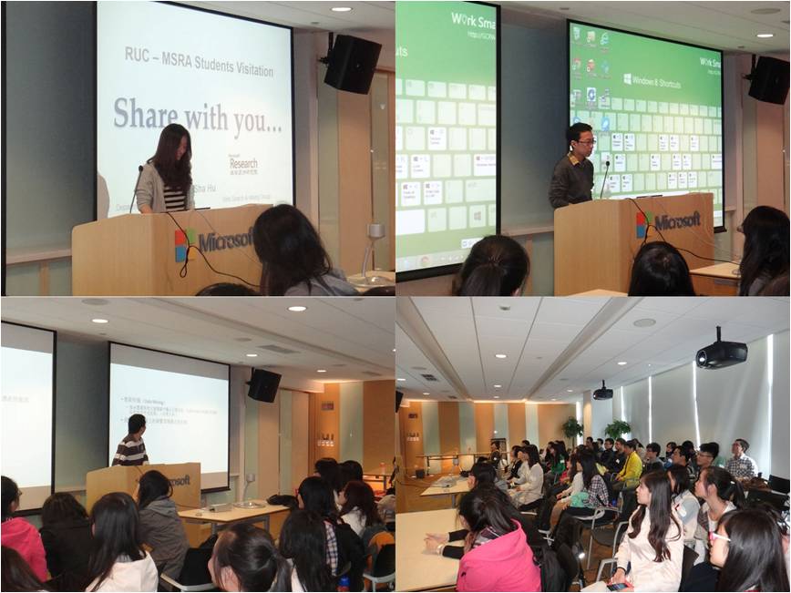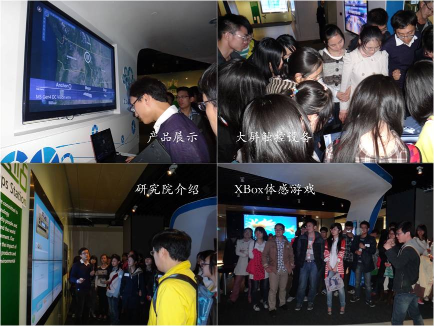 本次参观活动主要分为参观和交流两个部分。首先,微软学术合作部蔡先生带领同学们参观了一楼访客中心。在这里,同学们看到了微软的最新研究成果,包括speech to speech translation、数据可视化(以美国降雨量和日本地震为例)、必应搜索、云计算及云平台服务等,同时也亲身体验了微软的Surface、Kinect(XBOX360体感周边外设)等科技产品。随后,同学们来到12楼工作区进行参观,了解并感受微软员工繁忙而有序的日常工作环境。在12楼会客厅内,蔡先生系统地介绍了微软亚洲研究院(MSRA)的基本情况、工作内容和内部结构,并对“明日之星”实习生计划等做了详细介绍,为将来想要进入微软实习或工作的同学指明了努力的方向。