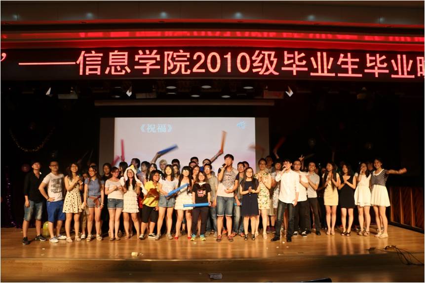 最后,毕业晚会以一首合唱《祝福》落下帷幕,同时主持人登台并致结束词,至此3354cc金沙集团“信·惜”毕业晚会圆满落幕。今夜过后,10级毕业生即将离开校园,祝愿各位信息学子能够在今后的人生道路上拥抱理想,再创辉煌。