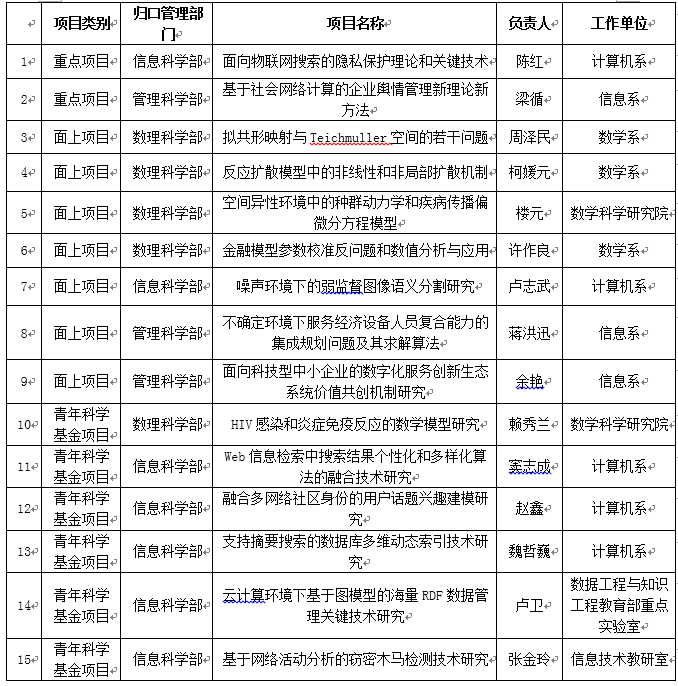 近日,国家自然科学基金委员会公布了2015年度集中受理项目的评审结果,3354cc金沙集团获得4项重点项目,其中管理科学部3项,信息科学部1项,创历史新高,其中3354cc金沙集团获得2项。在今年已经公布的项目中,3354cc金沙集团共获得52项资助,其中3354cc金沙集团(含教育部数据工程与知识工程重点实验室、数学科学研究院)获得15项,位居全校首位。
