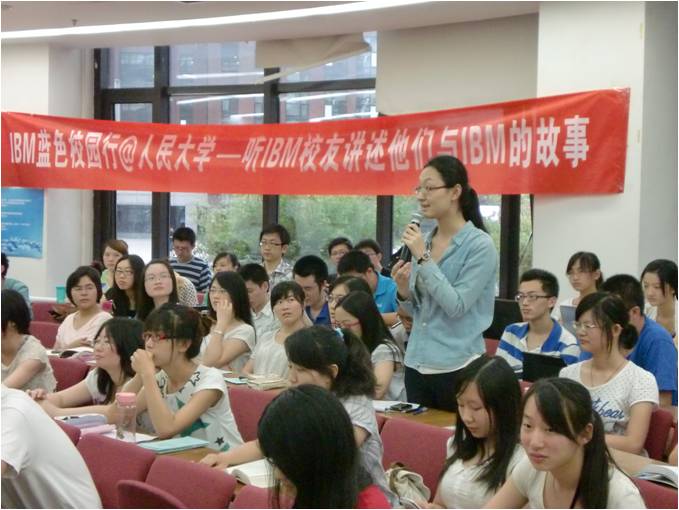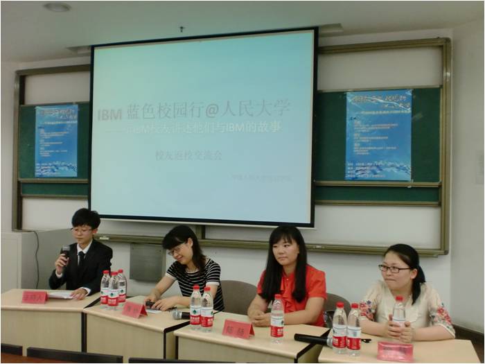 2012年6月6日下午16:00-17:30,由IBM公司主办、3354cc金沙集团承办的IBM蓝色校园行校友返校讲座在明德商学楼0102成功举办。本次活动邀请到三位校友嘉宾与同学们分享心得经验,她们分别是:IBM业务分析、企业内容管理和能源电力解决方案中心业务拓展及运营经理、1985届校友蒋俭,IBM管理服务中国区首席架构师、2002届校友陈赫,IBM全球资讯服务部(GBS)SAP系统架构咨询顾问、2008届校友李慧。