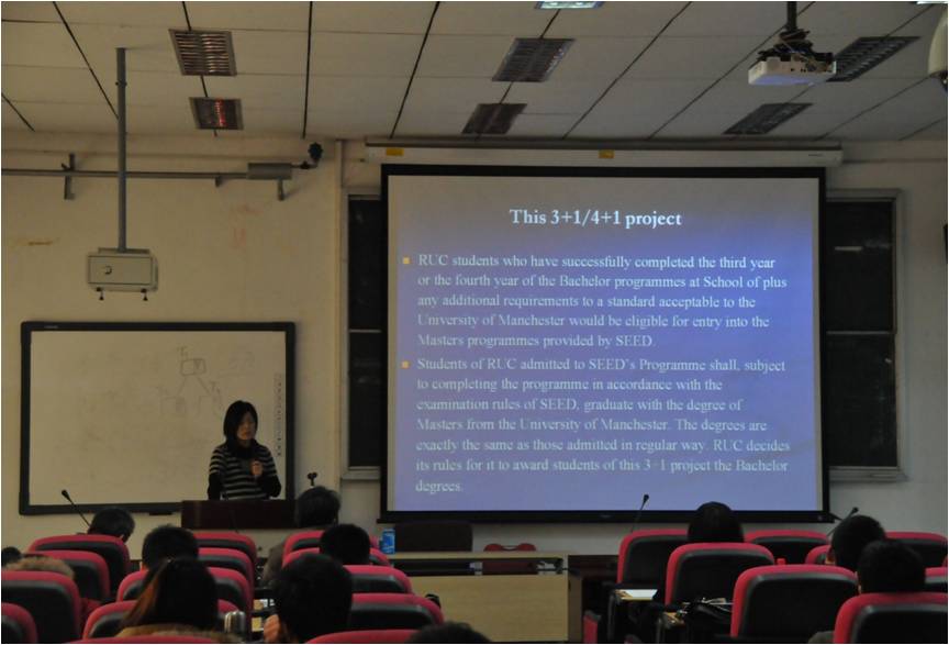 首先与同学们交流的是负责欧洲项目的付虹蛟老师,她为同学们讲解了挪威科技大学、英国的雷丁大学和曼彻斯特大学的交流项目的政策及学校的基本状况。对于挪威科技大学,她主要介绍了这所大学的IME学院,用往届的数据让大家了解了IME学院与我校的合作关系。她还介绍了交换项目的费用、学期、交流对象及最终学位,讲解内容十分详尽。而对于雷丁大学,付虹蛟老师分享了自己去参观时的经历,介绍了雷丁大学的校园及周边环境,解释了交流项目中的双硕士项目及“4+1”项目的内容。最后她介绍了这所位于英国第二大城市的曼彻斯特大学,内容包括其“3+1”和“4+1”项目、入学的要求及所需的费用和生活条件等。在大学情况讲解结束后,不少同学举手提问,她一一详细地解答同学们的疑惑。