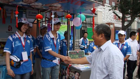纪校长首先来到人民大学西门城市服务站点,与站点城市志愿者亲切握手、向他们表示慰问。志愿者向纪校长介绍了站点的工作情况,当听到志愿者帮助美国北卡大学Dr.T教授找到遗失行李时,纪校长点头说:“好啊,我在《北京青年报》上看到了你们的事迹,今天特意来看望帮助外国友人的志愿者们。”在志愿者的热情邀请下,纪校长欣然提笔写下奥运寄语“为祖国自豪、为北京喝彩、为奥运加油!”,并指出这是他在火炬传递时的心情感受,与大家分享共勉。离开站点时纪校长叮嘱志愿者:奥运志愿服务的硬仗才刚刚开始,希望大家坚守岗位、持之以恒,为祖国为学校争光。