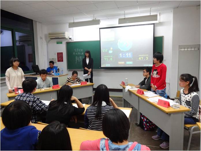 赛前,辩手们认真准备,通过网络、图书馆等途径查阅了大量资料,队员间彼此讨论商榷,不断提出建议并进行修改。赛场上,双方辩手旁征博引,你来我往,侃侃而谈。有辩手引经据典,博古通今,充分显示其丰富的文学底蕴;也有辩手语言流利顺畅,声音高空嘹亮,充分显示其高超的表达技巧;更有辩手引用网络时新词汇,热点事件,使论据更加生动有趣。而随后的自由辩论环节中,双方辩手争锋相对,毫不示弱,随机应变,沉着应对,一次次思维的碰撞更将比赛升温,推向了高潮。