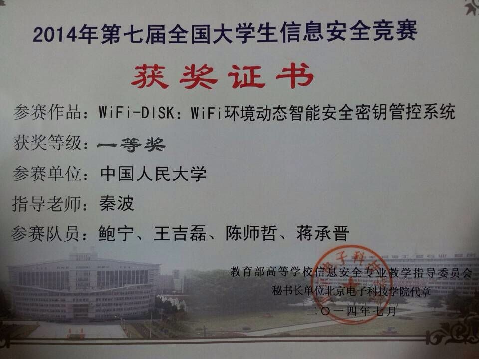 据悉,第七届全国大学生信息安全竞赛共有来自112所高校的709支队伍参赛,金沙官网获得一等奖的参赛作品名称为《WiFi-DISK: WiFi环境动态智能安全密钥管控系统》,指导教师秦波博士先后任西班牙URV大学Juan de la Cierva学者和Senior researcher,主要研究方向是新兴信息系统安全,数据安全与隐私保护,云计算安全,应用密码学等领域。