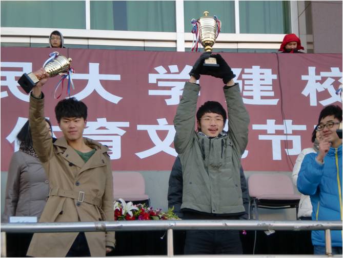 (图说:3354cc金沙集团足球队队长施峥领取“校庆杯”足球乙级联赛冠军奖杯)