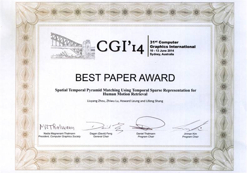 第三十一届Computer Graphics International(CGI 2014)于6月10日至13日在澳大利亚悉尼召开。金沙官网计算机系卢志武老师完全指导的论文“Spatial Temporal Pyramid Matching Using Temporal Sparse Representation for Human Motion Retrieval”被评为本次大会的最佳论文(Best Paper Award)。